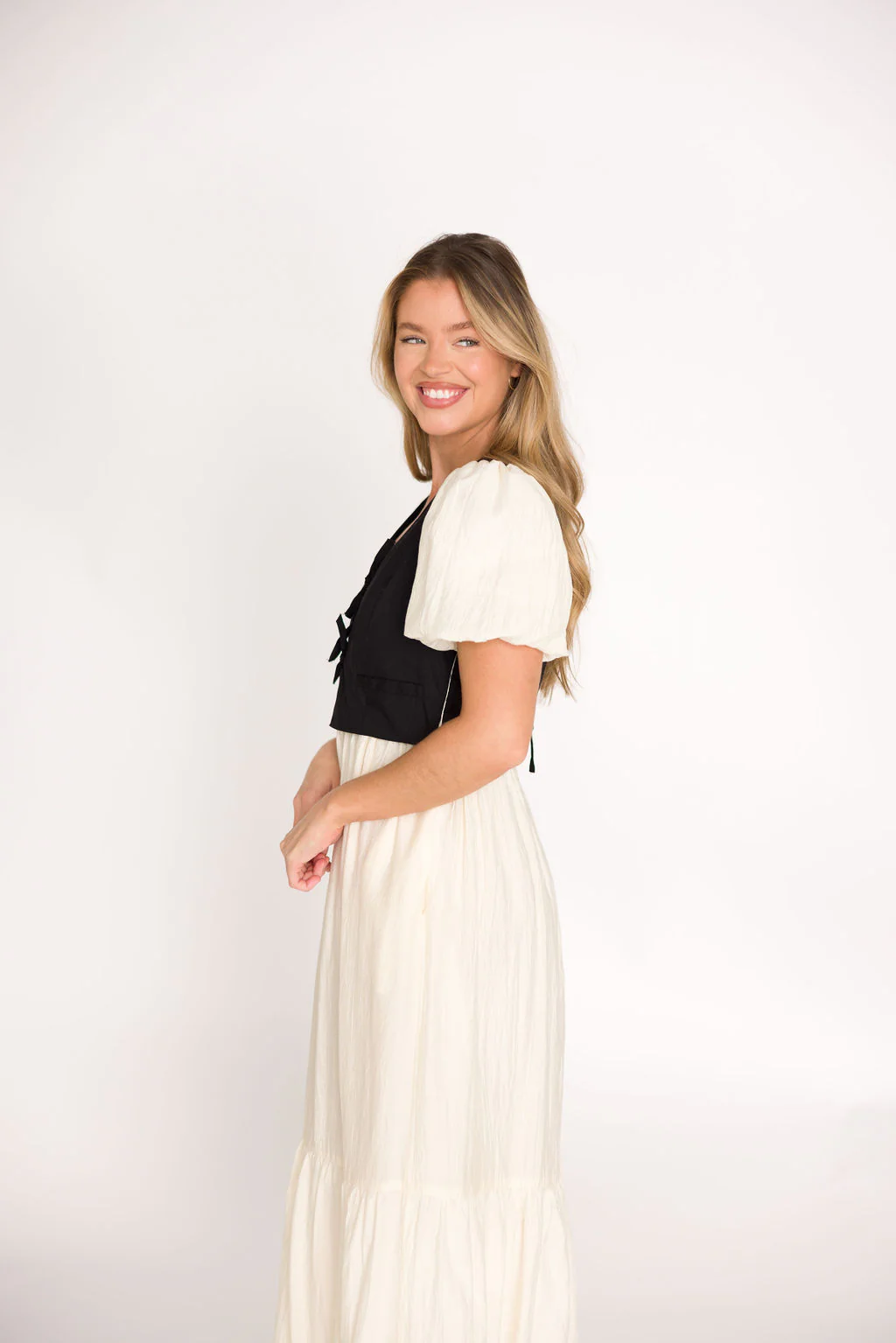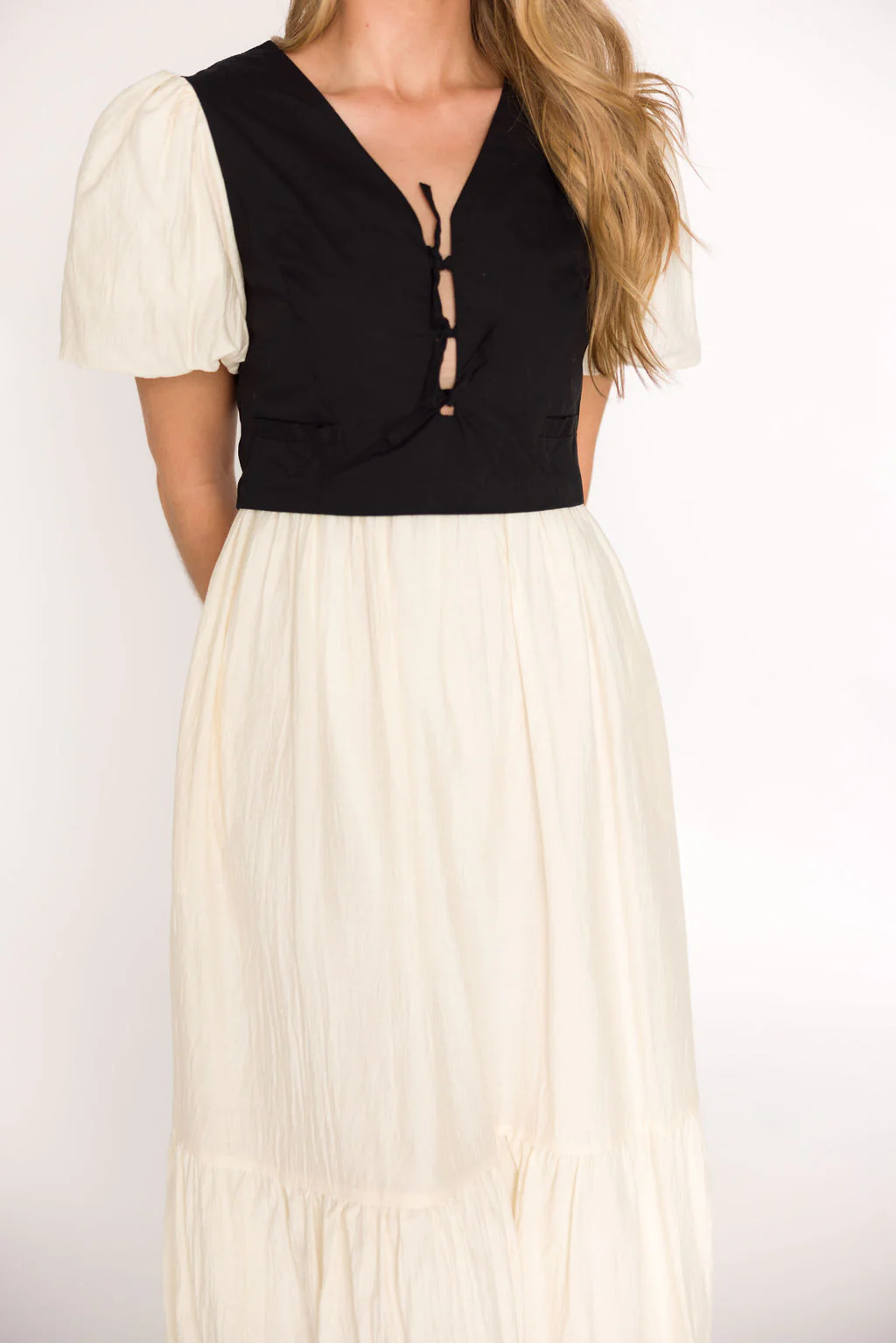Mya Contrast Tie-Vest Midi Dress in Ivory/Black