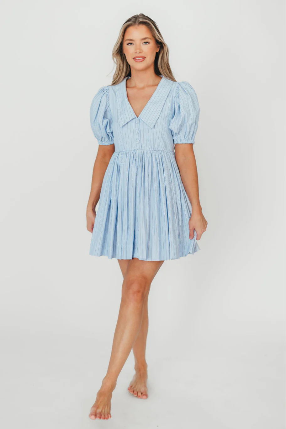 Camilla Pinstripe Collared V-Neck Mini Dress in Blue