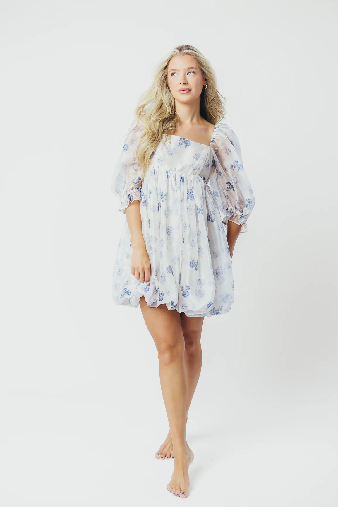 Chase Bubble Hem Mini Dress in White/Periwinkle