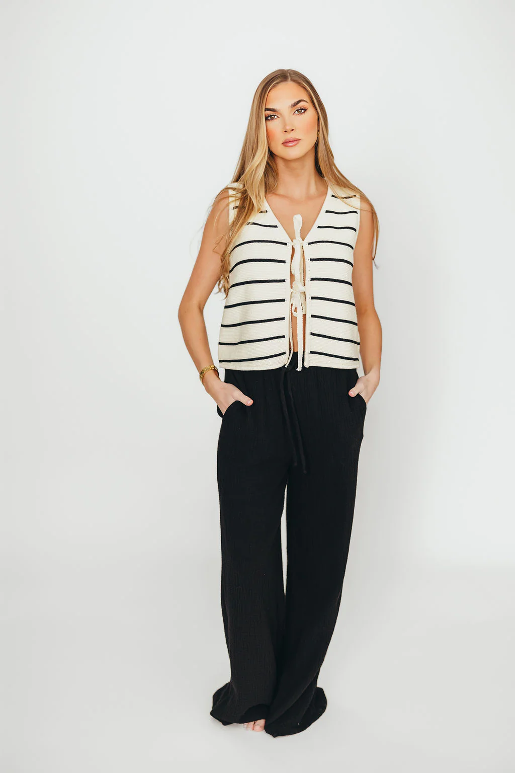 Sadie Striped Knit Vest with Tie Front in White/Black