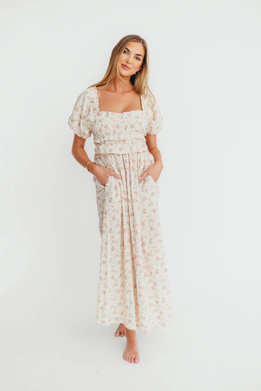 Cecilia 100% Cotton Smocked Maxi Dress in Ivory/Mauve Floral - Bump Friendly