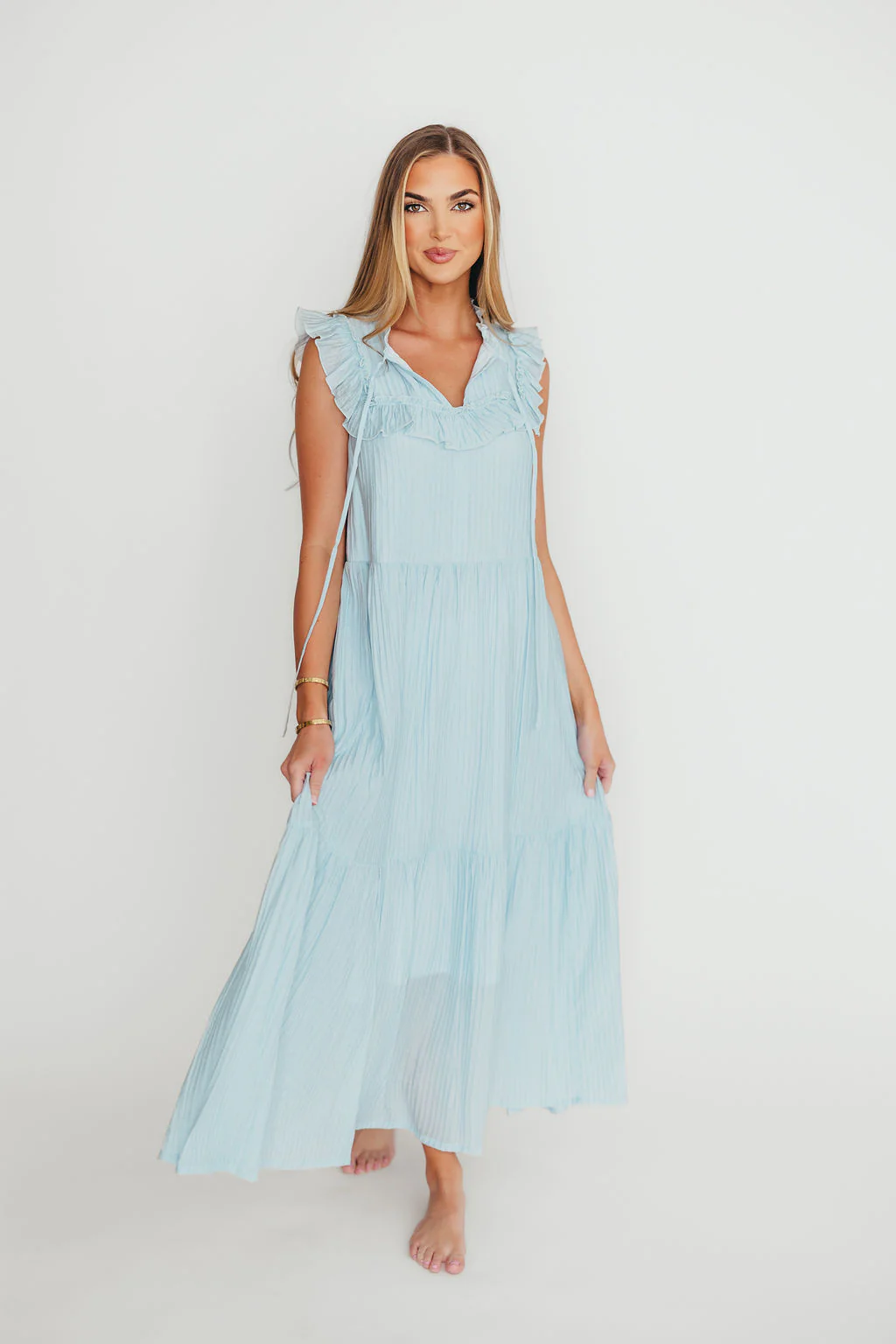 Brynn Ruffle Tiered Midi Dress in Blue