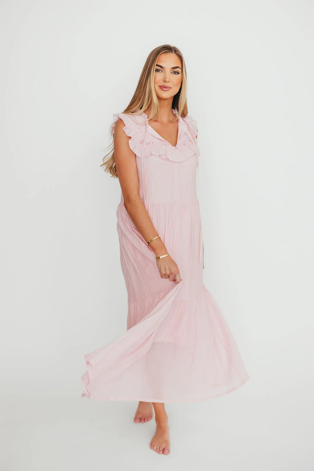 Brynn Ruffle Tiered Midi Dress in Pink