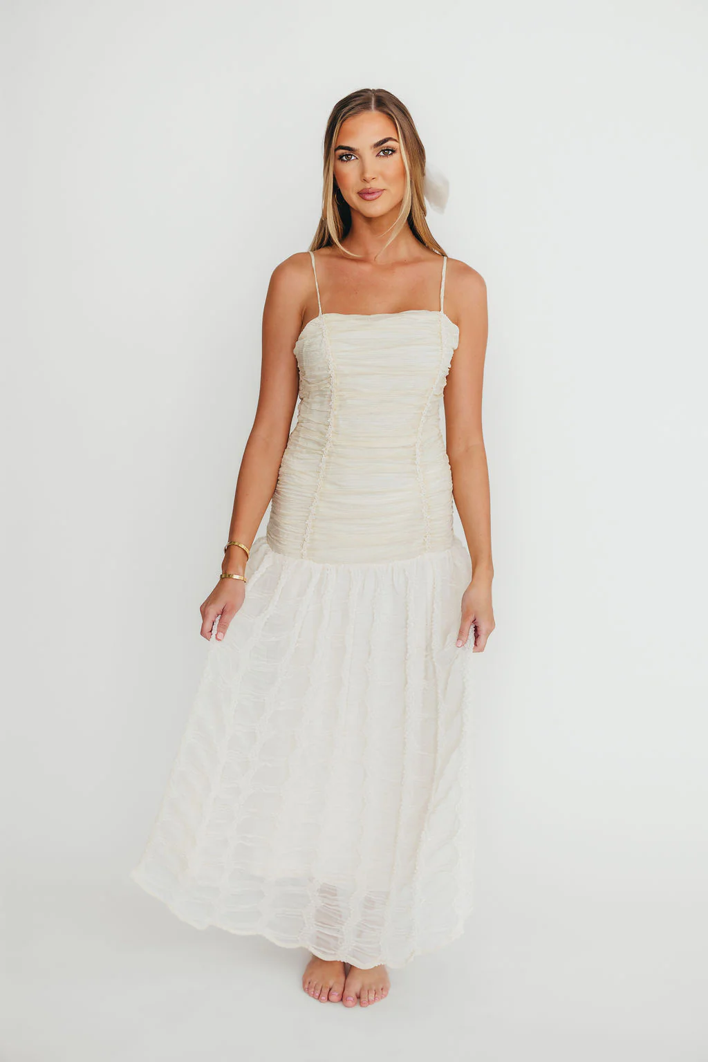 Rosie Ruched Maxi Dress With Bow Back Detail in Cream